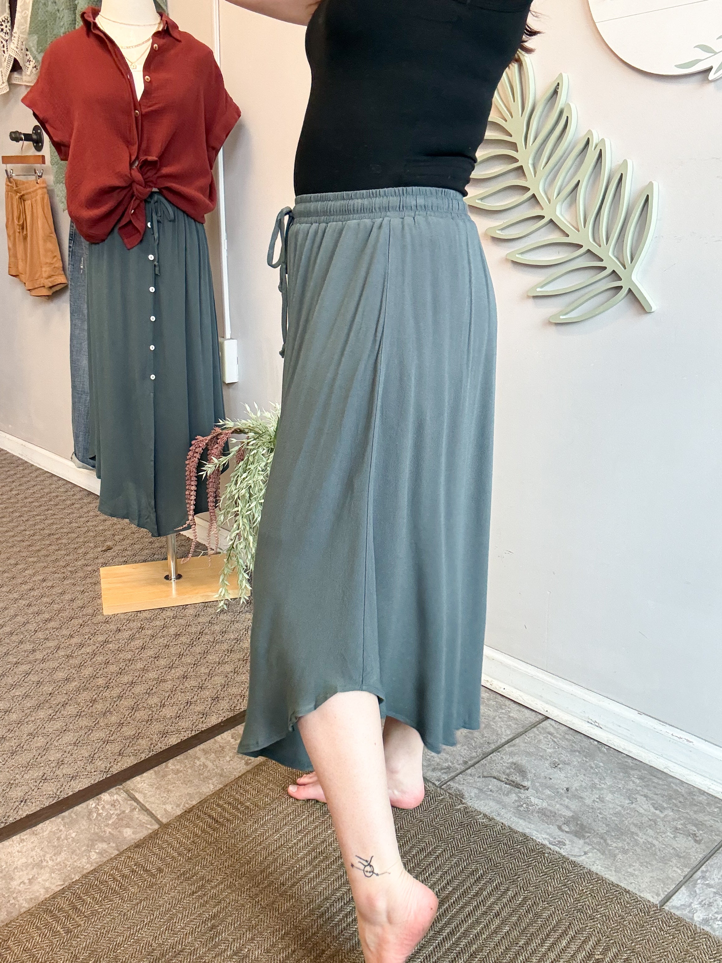 SCOOP HEM BUTTONS STRETCHED WAIST BAND WITH DRAWSTRING SWING SKIRT -SKIRT HAS LINING -100% RAYON