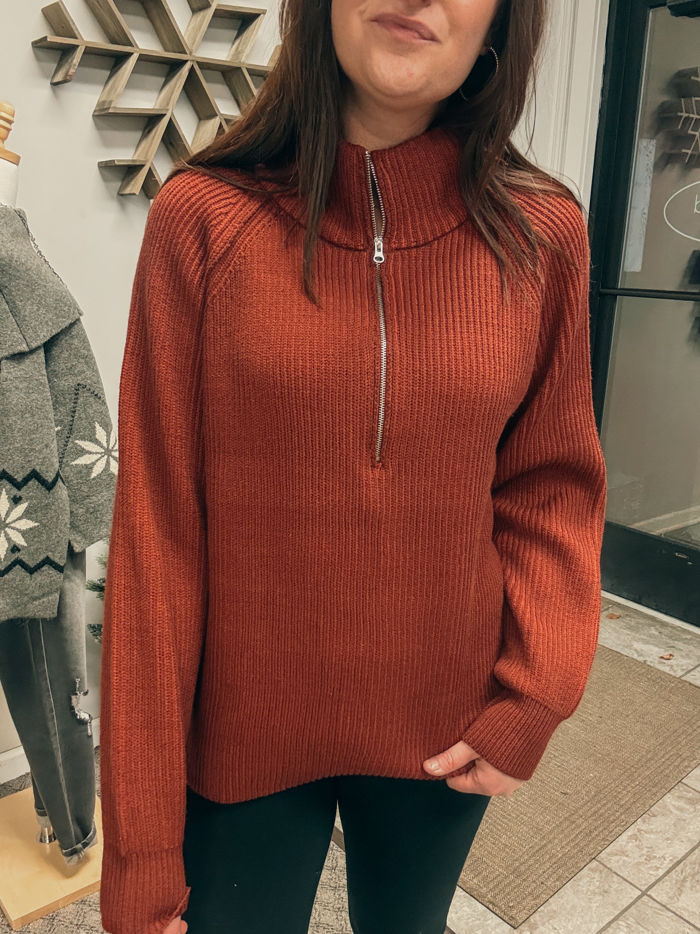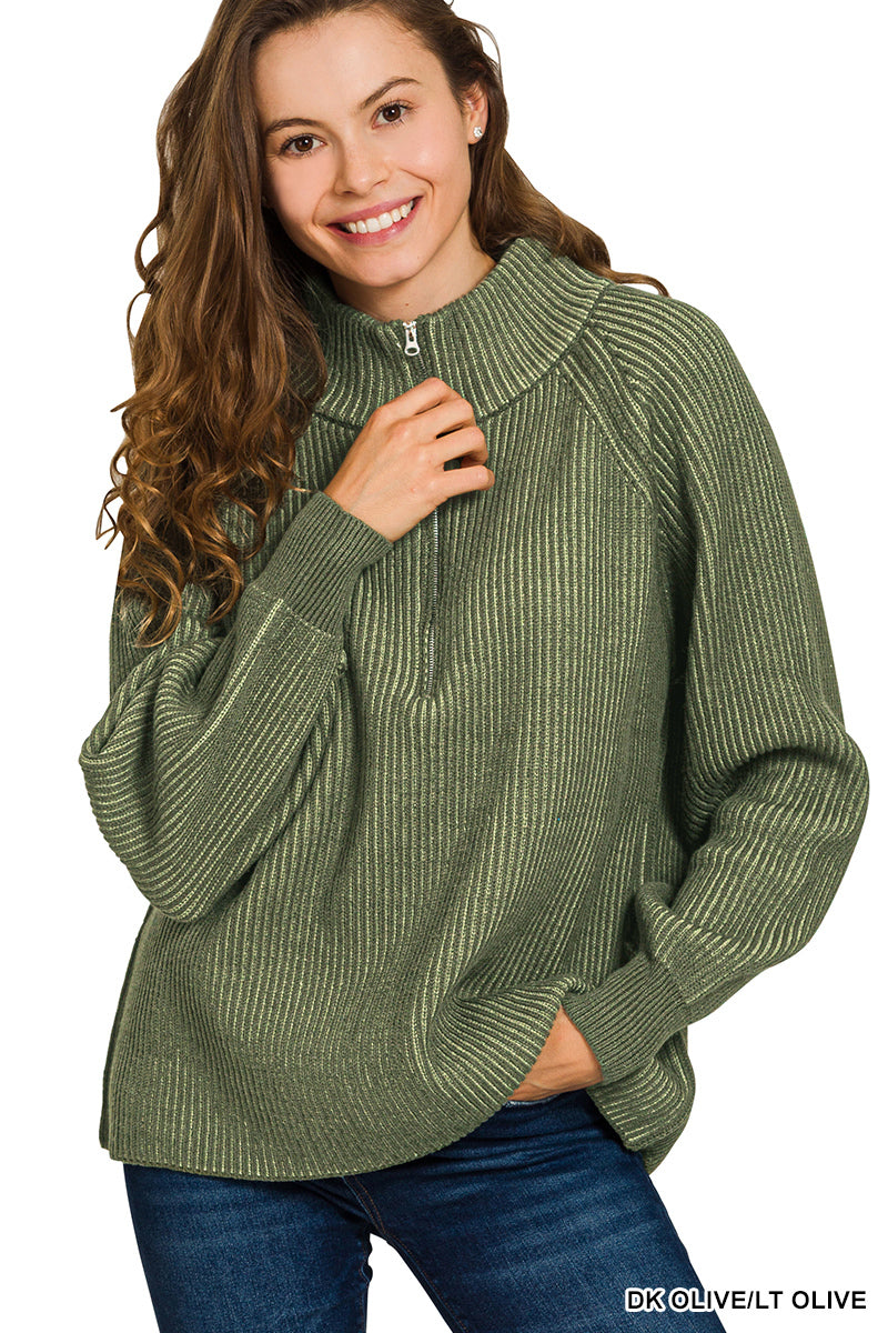 -ribbed two tone half zip sweater